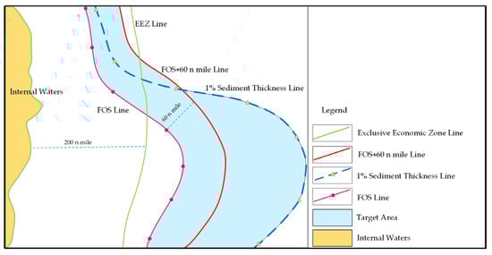 Combining Table 1, the geodetic line distances between adjacent points on the two formula lines demonstrate that by judiciously selecting azimuthal increment parameters and utilizing baseline points optimization algorithm constrained by length threshold, the boundary points of both formula lines can meet the requirements set by Article 76 of the Convention, which mandates that the line connecting boundary points not exceed a length threshold of sixty nautical miles. As shown in Figure 8c, based on the same set of FOS, the FOS+60 n mile line and the 1% sediment thickness line intersect, leading to a significant overlap between the continental shelf areas delineated independently by the two formula lines. Referring to Table 2, although the continental shelf area delineated by the 1% sediment thickness line is larger, with a difference of 1,494,056,345 m2 compared to the FOS+60 n mile line, it is still less than the total area of the continental shelf regions combined (i.e., the intersection method continental shelf area), which shows an area gain of 222,347,492 m2 when compared to the 1% sediment thickness line area.