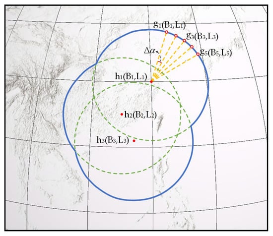 To effectively prevent the impact of map projection deformation on buffer zone construction, reference [16] proposed a projection-independent point feature buffer zone construction technique based on the Earth’s ellipsoid, after a thorough analysis of the causes of errors. By using the geodetic line lengths as the distance measure for point feature buffer zones, this method eliminates the boundary displacement errors caused by map projection length deformation, thereby enabling high-precision determination of boundaries for ellipsoidal surface point feature buffer zones. Assuming represents the geographic coordinate of the point feature, and R is the radius of the buffer zone, to construct a buffer zone based on the Earth’s ellipsoidal surface, it is necessary to set an azimuthal increment parameter . Subsequently, using as the starting point and the buffer radius R as the distance parameter, the azimuth parameter is selected in equal increments. Utilizing the direct geodetic formula [30], the boundary points are calculated in sequence, thus constructing the collection of boundary points for the point feature buffer zone. The rule for selecting azimuth increments is as follows: