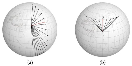 As shown in Figure 4a, taking the Eastern Hemisphere as an example, when the starting point of the geodetic line is fixed and the longitude difference to the endpoint is determined, the endpoint trajectory forms a meridian. On this meridian, there always exists a specific point P. When this point is the endpoint of the geodetic line, the geodetic line is perpendicular to the meridian at this point. At this time, the geodetic azimuth angle from the endpoint to the starting point is taken as 270° (when the longitude difference from the endpoint to the starting point is positive) or 90° (when the longitude difference is negative), referring to the definition of the shortest distance from a point to a line on an ellipsoidal surface from reference [31]. The geodetic line with point P as the endpoint is the shortest in the cluster of geodetic lines with fixed starting points and determined longitude differences. Furthermore, if the endpoint moves south or north along the meridian from point P, the length of the geodetic line always tends to increase; as shown in Figure 4b, when the starting point of the geodetic line is fixed and the latitude difference to the endpoint is determined, the length of the geodetic line always tends to increase with the increase in the longitude difference from the starting point to the endpoint. When the endpoint Q is on the same meridian as the starting point, this geodetic line is the shortest in the cluster of geodetic lines with a fixed starting point and determined latitude difference.