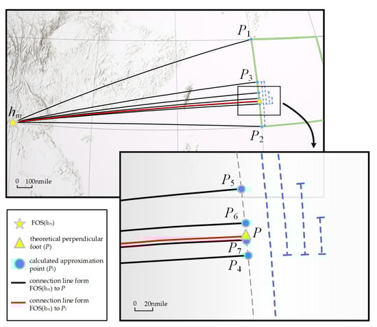 In Formulas (4) and (5), , , , represent the geodetic azimuth angle from the four corner points of the grid to a particular FOS (). When is located to the east of the grid, the geodetic azimuth angle for the corner points on the right boundary of the grid is calculated, and according to inequality (4), the azimuth angle interval formed by the two corner points is assessed for inclusion of . If the interval includes , it indicates that a specific point P certainly exists between the two corner points along the longitude line such that the geodetic line from this point to is perpendicular to the longitude line; similarly, when the is located to the west of the grid, the geodetic azimuth angle for the corner points on the left boundary is calculated, and by inequality (5), it is possible to determine whether a point P exists between the two corner points along the longitude line segment.