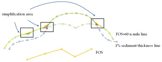 The FOS+60 n mile line and the 1% sediment thickness line are two boundaries drawn according to different rules, both of which can independently serve as the outer boundary of the continental shelf and are recognized by the Convention. However, when the two lines intersect, to ensure the maximization of coastal state interests, it is necessary to consider using both as the basis for delineating the formula limit of the continental shelf. How to handle the topological relationship between the two is the key to planning a comprehensive delineation scheme. According to reference [34], it is suggested that the intersection points of the two formula lines should be determined first, and then the outer segments of the two formula lines towards the sea should be selected based on these intersection points and combined to form a coherent external envelope line. As shown in Figure 6, the green dashed line represents the FOS+60 n mile line, and the blue dashed line represents the 1% sediment thickness line. To calculate the external envelope line of the two formula lines, the intersection points of the two formula lines need to be determined first. Then, based on these intersection points, the outer segments of the two formula lines towards the sea are selected and combined to ultimately achieve the construction of the external envelope line (shown as the yellow solid line in the figure). Although this method can delineate the formula limit of the continental shelf while complying with the Convention, there are still two limitations. Firstly, the calculation process requires solving the technical problem of accurately intersecting two geodesic lines on the ellipsoidal surface. Secondly, due to the failure to fully utilize geometric construction rules, delineating the outer formula limit of the continental shelf in this way may result in partial loss of the continental shelf area of the coastal state.