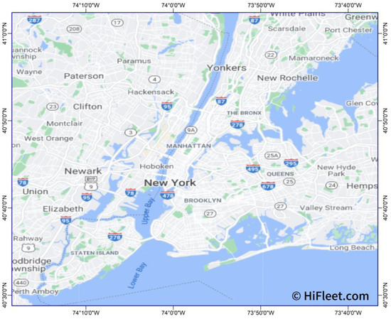 The geographic boundaries of the study are from 40.48° N to 41.04° N latitude and 73.61° W to 74.31° W longitude (Figure 1), and the statistical timeframe for the data analyzed is from 1 January to 31 December 2022. We conducted a detailed study to assess the air emissions emitted by ships while navigating in New York Harbor. Note that data can be accessed by sending an email to the corresponding author. Figure 2 shows the geographic location of the port in detail, including latitude and longitude.