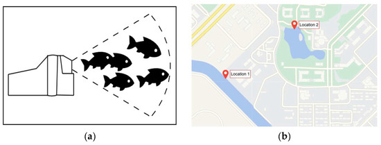 Sample data were collected in the lakes of the Luchao River and the pond in front of the library of Shanghai Ocean University. The sonar model is oculusM750d (Blueprint Design Engineering Ltd, Cumbria, UK), with a horizontal viewing angle of 130 degrees, a vertical viewing angle of 20 degrees, and a maximum range of 120 m. To collect data on fish in different postures under different environments, the data were collected during the daytime and night-time, on sunny and rainy days, and with or without bait. The data collection method of the sonar equipment is shown in Figure 1a, and the data collection locations are shown in Figure 1b. To ensure the validity and diversity of the data, the collected video data were subjected to frame extraction [23], and the data with high similarity and poor imaging quality were manually deleted. One thousand, one hundred and seventy-two images with abundant fish postures and relatively low noise were selected from 9875 images. At the same time, to avoid too many images with the same posture, the same position, and too simple background conditions, the selected 1172 images were screened twice, and finally, 158 representative images were obtained.