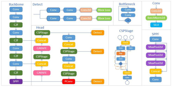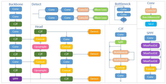 The YOLOv8 network consists mainly of a backbone and a head section. The network structure is shown in Figure 2.