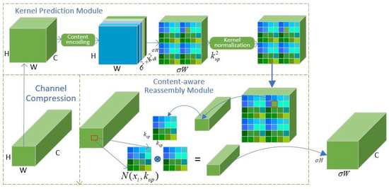The upsample layer of YOLOv8 is dominated by the nearest neighbor interpolation method, which relies on the nearest neighbor pixel values and cannot capture the subtle changes and dense semantic information in images, making the image distorted. When the image is enlarged, it blurs the image, and the perception field of view becomes smaller, which affects the results of object detection. To solve the above problems, this paper adopted CARAFE, a lightweight upsampling operator with a large perceptual field of view to replace the original upsampling module. CARAFE used feature-aware recombination to upsample the features, predicted the recombination kernel, and defined the recombination features at each position using the underlying information [26]. The flow of CARAFE is shown in Figure 4, which consists of the upsampling kernel prediction module and the feature recombination module in two parts. Firstly, the feature map was compressed by 1 × 1 convolution into a feature map, and then after content encoding and upsampling kernel prediction, a upsampling kernel was obtained. After the content encoding and upsampling kernel prediction, the up-sampling kernel was normalized so that its convolutional kernel weights are summed to 1. Next, each position in the output feature map was mapped back to the input feature map, the region with the center was taken out, and dot produced it with the predicted upsampling kernel for that position to obtain the output value. Different channels at the same position shared the same upsampling kernel and finally output the feature map. The lightweight upsampling operator CARAFE could better capture and aggregate the semantic information of fish schooling sonar images without increasing the computational cost [27], thus improving the object detection performance.