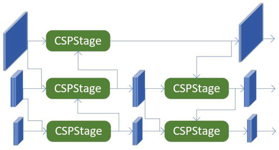Feature fusion is now the main method to deal with the multi-scale disparity problem, and the representative algorithms are feature pyramid network (FPN) [28], path aggregation network (PANet) [29], and bidirectional feature pyramid network (BIFPN) [30]. Their core idea is to aggregate multi-scale features extracted from the backbone network. However, these feature pyramid network structures only focus on feature scales and ignore feature levels. GFPN uses a new cross-scale fusion method to provide more efficient information transfer by aggregating features from the same and neighboring levels [31], and its network structure is shown in Figure 5. To increase feature fusion across more scales within the fish population, a new skip connection method was proposed, where each level received input from the previous node along with those from nodes diagonally above and diagonally below. In addition, the Concat method is used for feature fusion, which efficiently prevents the disappearance of the gradient and extends it to a deeper network. The module formed by the method is the CSPStage, and its network structure is shown in Figure 6.