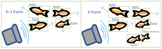 The tracker relies on the overlap of the predicted target motion trajectory borders and the detected target trajectory borders. The dynamic nature of sonar equipment can cause the video image to shake and the border position to shift, resulting in inaccurate prediction matching. Meanwhile, since KF is a unified linear motion model, it is unsuitable for tracking nonlinear motion targets, and the underwater sonar equipment can be impacted by surge currents, resulting in fish positions in the pixel image becoming jittery and the tracking target is lost. Therefore, the BoT-SORT algorithm uses OpenCV’s global motion estimation (GME) technique to improve this limitation. Firstly, the key points of the image are extracted, then the sparse optical flow is performed to match the images between neighboring frames, which is regarded as an approximation of the projection of the rigid motion of the camera on the image plane. Finally, the random sample consistency is used to compute the affine transformation matrix, predicting the fish boundary frame transformed from the k − 1 frame coordinate system to the K frame coordinate system. Thus, the relative motion of the fish school is converted to changes in the coordinate system, which compensates for the blurring of the bounding box caused by the irregular motion of the target. The schematic diagram of the sonar device to compensate for the movement of the fish school is shown in Figure 9.