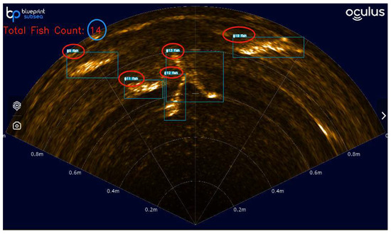 Since the tracking and counting performance of YOLOv8 and BoT-SORT algorithms depend on object detection accuracy, two frames containing the counting effect of fish were randomly selected from the video data to verify the tracking and counting effects. Due to the high amount of noise in sonar imaging, the IoU threshold was set to 0.7, and targets below 0.7 were suppressed to avoid false positives. These frames represent the cases of a small number of fish and a large number of fish, respectively, as shown in Figure 13.