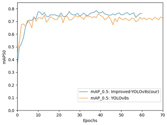 The recall rate of the improved model reached 76.7%, and was 78.5%. Compared with the base YOLOv8s model, each index increased by 3.8% and 2.5%. Compared with the YOLOv8n model, each index increased by 6.1% and 4.8%. A comparison of the results of the algorithm before and after the improvement is shown in Figure 11.