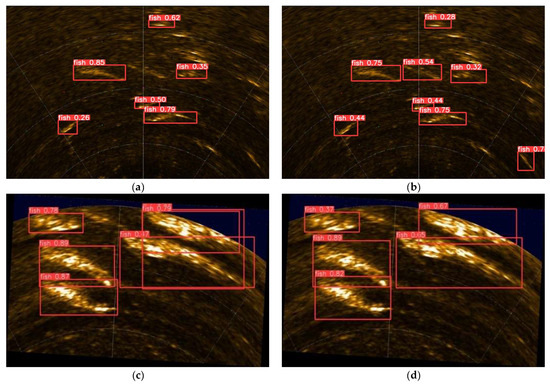 The left side in Figure 12 shows the results of the model detection before improvement, and the right side shows the results of the improved model detection. By analyzing the figure, we can observe the difference before and after the model improvement. The pre-improved model missed two fish targets in Figure 12a, while in Figure 12b, the two missed targets were detected normally. One fish target was overdetected in Figure 12c, and in Figure 12d, it can be seen that the false detection was improved. The results show that the improved algorithm reduced the missed detection rate and false detection rate while increasing the accuracy and mAP, which provides strong support for subsequent fish tracking and counting.