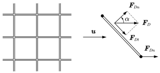 The principle of the model is to decompose the netting into individual net threads. Due to their small scale, the drag acting on each net thread can be calculated using Morison equation, as shown in Equation (1). The total drag on the netting is the sum of the forces experienced by each net thread.