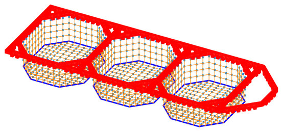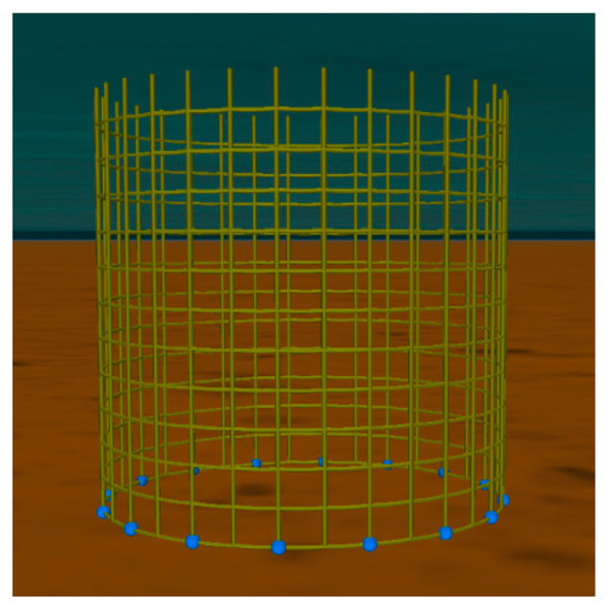 In the numerical simulation, the netting structure was represented equivalently using the mesh group method, as shown in Figure 4. The parameters of the experimental model and the numerical model are listed in Table 1. The numerical model consists of 32 × 12 meshes along the circumference and radial directions of the netting, respectively. The displacement and deformation of the top of the netting were neglected, with the upper nodes fixed directly at the water surface. Taking a sinker weight of 600 g as an example, the bottom weighting in the numerical model was set the same as in the experiment.