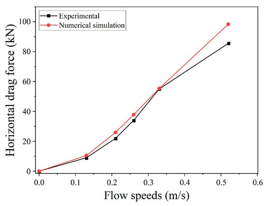 Comparison of horizontal drag forces between numerical simulation and experiment.