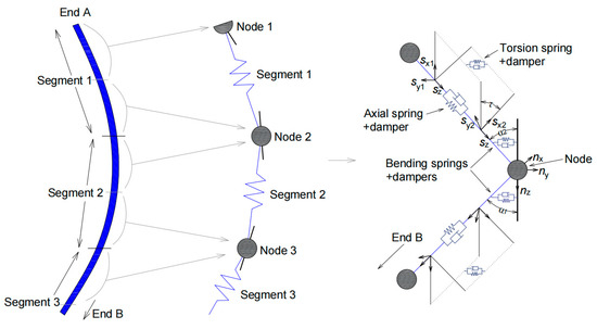 The mooring system is the foundation of the platform in the marine environment, so it is essential to accurately analyze the dynamic response of the mooring system. This paper employs the finite element model [34] to investigate the dynamic response of mooring lines. The finite element model of the mooring line is shown in Figure 8: