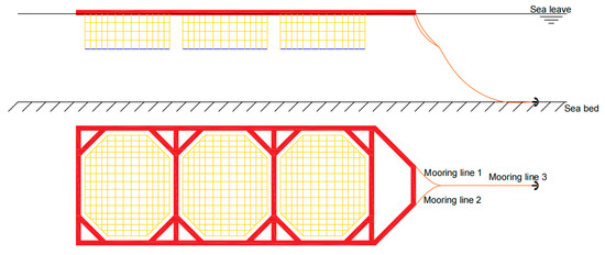 The innovative deep-sea aquaculture platform studied in this paper consists of the main structure and the netting system, as illustrated in Figure 9. The frame of the main structure is ship-shaped and made of steel. Underneath the frame, floats made of HDPE material are arranged, which provide buoyancy and reduce costs. The frame and the floats are connected by bolts. The setup includes three cages, with walkways between adjacent cages to facilitate staff access for managing the aquaculture conditions within each cage. The main parameters of the platform and the cages are shown in Table 2 and Table 3, respectively.