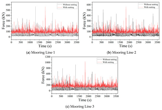Figure 17 illustrates the time history curves of mooring line tension responses for the platform with and without netting, with statistical results shown in Table 9. In both scenarios, Mooring Line 3 exhibits the highest tension response. For the numerical model without a netting structure, the tensions in Mooring Line 1 and Mooring Line 2 are 568.60 kN and 511.66 kN, respectively. Due to the intense fish-tailing motion of the platform, the maximum tension difference between the two lines is 59.64 kN, although their average tensions are essentially identical. After incorporating netting into the numerical model, the average tensions in each line show varying degrees of increase, while the standard deviations decrease. This change is attributed to the netting causing an overall increase in the flow load on the platform, but the increased damping reduces the amplitude of the motion response of the platform. Consequently, this leads to a higher average level of tension in the lines but with a tendency towards stability. For mooring line 1, the peak tension values are similar in both scenarios, which is because the tension in the mooring line is related to the movement of the platform. Since the direction of the waves and the current is 180°, the smaller the surge value of the platform, the farther the platform is from the anchor point, resulting in a longer suspended segment of the mooring line and higher tension. As shown in Figure 15a, the minimum surge values of the platform are similar in both scenarios. Combined with the fish-tailing motion of the platform, this results in higher peak tension in mooring line 1 when the netting is absent.