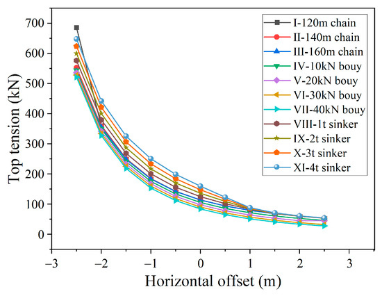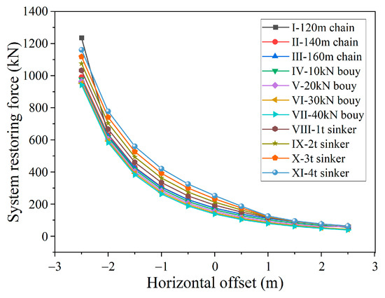 Figure 19 examines the variation characteristics of the top tension of the mooring lines at the fairlead as the platform shifts along the X-axis. As the platform moves closer to the anchor point, the decrease in top tension of the mooring lines in all scenarios exhibits a nonlinear behavior. In scenario Ⅰ, when the X-coordinate of the platform is at −2.5 m, the top tension of the mooring line is at its maximum. This could be due to the insufficiency in mooring line length, causing the lying segment on the seabed to be completely lifted off. After adding buoys to the mooring lines, the top tension decreases as the buoyancy of the buoys increases. Conversely, after adding sinkers to the mooring lines, the top tension increases with the mass of the sinkers when the platform is far from the anchor point. As the platform approaches the anchor point and the sinkers transition from a suspended state to resting on the seabed, the influence of the weight on the top tension of the mooring lines decreases. For reference, the total horizontal restoring force provided by the mooring system as the platform shifts along the X-axis is illustrated in Figure 20.