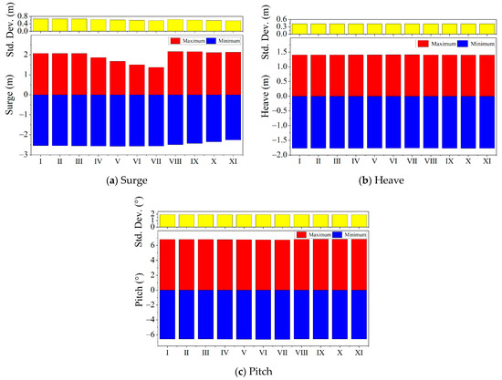 The motion response statistics for the platform under various scenarios are shown in Figure 21, with a particular focus on the surge, heave, and pitch motions of the platform. It is observed that for the innovative deep-sea aquaculture platform, the motion response is not particularly sensitive to changes in the length of the mooring lines.