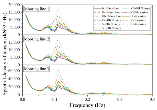 Figure 23 investigates the power spectra of various mooring lines. For the platform structure, the impact of current-induced loads is significant, and the contribution of low-frequency responses to the overall tension response cannot be ignored. Altering the length of mooring lines has minimal impact on tension responses; however, adding mooring components alters the distribution of tension within the mooring lines, increasing wave frequency tension responses, with sinkers having a more pronounced effect.