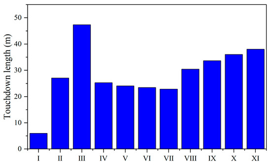 Figure 24 illustrates the variation curves of the minimum touchdown length of the mooring lines across different scenarios. To ensure the safety of the mooring system, it is necessary that when the platform reaches its maximum displacement, a portion of the mooring line still touches the seabed. Therefore, mooring line schemes with longer lengths should be chosen as much as possible. However, the length of the mooring lines cannot be arbitrarily increased due to factors such as the scope of the sea area and construction costs. The graph shows that the touchdown length of the mooring lines increases with the total length of the lines, and the relationship between the two is essentially linear.