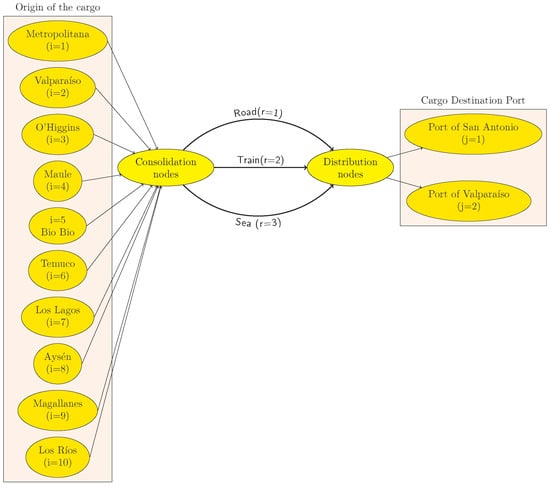 A mathematical model is used to determine the distribution of loads and warehouses, identifying concentration and distribution nodes, as shown in the conceptual diagram of the multimodal system in Figure 2. The diagram illustrates the conceptual organization of the mathematical model. On the left, cities from the center to the south of the country are shown within a rectangle, indicating the origin points for cargo headed towards central zone ports. The ports of San Antonio and Valparaiso are depicted on the right within a square. The diagram is centered on two ellipses representing potential intermediate nodes. The left ellipse symbolizes a potential cargo consolidation node, where various cargo types such as general, bulk, and liquid can be integrated to exploit economies of scale. This is done by factoring in both investment and annual operational costs within the model. The right ellipse suggests a potential cargo distribution node, tasked with deconsolidating and forwarding cargo received via road, rail, or ship to the ports.
