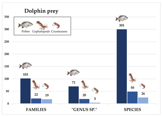 In the review, we counted the total number of prey found with a total of one-hundred-forty-four families (one-hundred-three fish, twenty-two cephalopods and nineteen crustaceans); ninety-six “genus sp.” (seventy-one fish, twenty cephalopods and five crustaceans) and three-hundred-seventy-seven species (three-hundred-one fish, fifty cephalopods and twenty-six crustaceans). Figure 1 shows that dolphins consume the greatest variety of fish prey, followed by cephalopods and crustaceans.