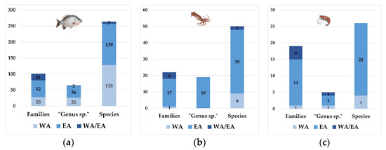 (a–c) illustrate, comparatively in WA, EA and WA/EA, the number of prey (families, “genus sp.” and species) of fish, cephalopods and crustaceans recorded.