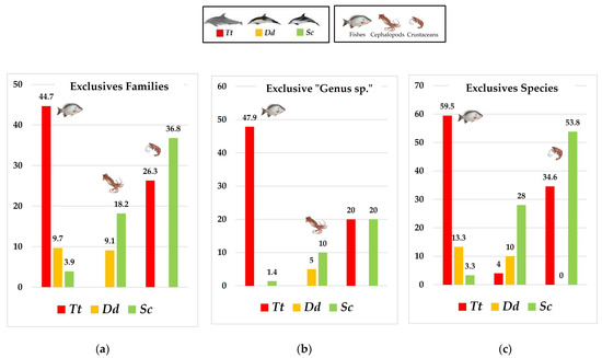 Percentages (%) of exclusive prey over the total number of fish, cephalopods and crustaceans consumed by each of the three dolphin species studied (Tt, Dd and Sc) (a) families; (b) “genus sp.” and (c) species.