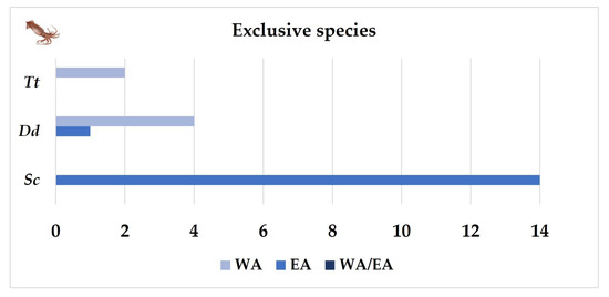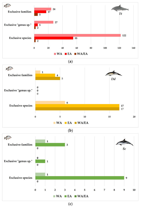 When analyzing the exclusive prey of Tt, prey fish from forty-six families were counted (twenty-four in WA, seventeen in EA and five in WA/EA). Of the thirty-four “genus sp.” counted, twenty-seven were in WA, five in EA and two in WA/EA. Finally, of the one-hundred-seventy-nine fish prey species counted, one-hundred-twenty-two are from the WA, fifty-five from the EA and two from WA/EA. In this dolphin species, it can be seen that it is in WA where there is the greatest diversity of species that are fish prey exclusive to Tt. However, in Dd and Sc, more exclusive fish prey were found in the EA than in the WA (Figure 4).