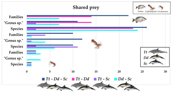 The numbers of families, genera and prey species shared by the three (or two of them) dolphin species are shown, comparatively, in Figure 6. Tt–Dd–Sc share twenty-two families, eleven “genus sp.” and twenty-six fish species; regarding cephalopods, ten families, twelve “genus sp.” and ten species; and, regarding crustaceans, two families, zero “genus sp.” and one species.