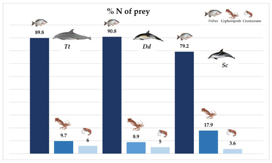 The quantitative analysis of each species group (Table S4) is shown in Figure 7. The average of the %N of all the reviewed papers is represented. It can be seen that all three dolphin species consume mostly fish species, followed by cephalopods and crustaceans. Sc consumes more cephalopods but less fish and crustaceans than Tt and Dd.