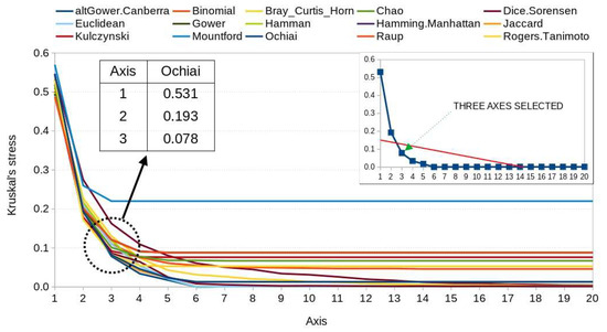 The stress decaying from one to twenty multivariate axes for 17 mathematical measures is plotted in Figure 8. It can be seen that the best combination is the Ochiai metric with three axes as more axes do not substantially decrease stress. In fact, the Kruskal stress drop is 53% with the first axis, with two we decrease by 77% and with three by 84.8%. Adding a fourth axis would decrease the stress by only 1.5% more. In other words, the increase in complexity of the multivariate representation is not justified in terms of stress reduction. This graphical test is similar to the one used in Principal Component Analysis, where the number of axes that capture 85% of the cumulative variance is selected. In NMDS, there is no independent variance on each axis as the axes are not orthogonal [61].