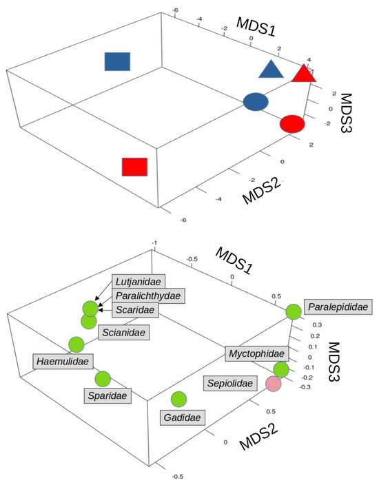 Top image: representation of dolphin populations and species in the three-axis multivariate space of the metric multidimensional scaling (MDS). In blue WA populations. In red EA populations. Squares: Tt; triangles: Dd; circles: Sc. Below: distribution of fish families (green) and cephalopods (pink) showing significance in the analysis of polyhedron area test.