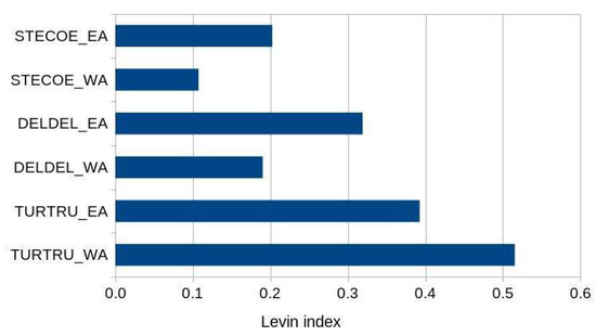 These results of the multivariate analysis are complemented by the Pianka niche overlap index between the EA and WA populations, which was 0.314 for Tt, 0.656 for Dd and 0.738 for Sc. Fewer fish species families are available for slow-swimming, deep-water stripers, so their diets tend to overlap more between populations. Tt feed in shallower waters and on larger species, so their diets are more variable. The Morisita index indicated 0.311, 0.627 and 0.693 for Tt, Dd and Sc. The Levin index is plotted for each population and species in Figure 10. According to these results, the Tt from the WA is the least specialized in its diet, followed by the Tt from the EA. It would be followed by Dd and Sc from the EA and, finally, Dd and Sc from the WA. Tt shows a great deal of variability in its trophic behavior between populations (little overlap). Dd would be in an intermediate situation and Sc would be the species showing the least variability in its fish diet, i.e., the greatest overlap between populations. The high specialization of striped dolphins seems to contradict the fact that no significant fish family is exclusively associated with them, but this may be precisely due to their specialization: feeding on the fish that other dolphins leave behind. In turn, Tt of EA and WA show such a different feeding spectrum that justifies that they are distinct populations, of high or total isolation, justified by the genetic differences already known (see [3]). The calculation of these indices has not been carried out on cephalopods because their association is exclusive to Sc and only one family is significant in the polyhedron test.