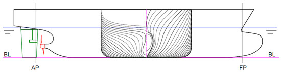 KCS model and appendages: (Black line) Ship hull; (Green line) Rudder; (Red line) Propeller; (Blue line) draft level; (magenta line) base line.