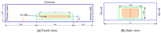 In this study, the hydrodynamic forces acting on the ship constitute the main concern for estimating the maneuvering derivatives. The results of the CFD-based simulation are verified with the experimental results from KRISO [30] and Gronaz [11]. Straight-line tests, circular tests, and combined tests are numerically simulated using the RANS-based method for incompressible flow. The fluid domains are chosen to avoid the influence of boundary conditions such as inlet, outlet, and side walls. For the stationary straight-line tests and the harmonic tests, the rectangular domain has opted. In the stationary straight-line tests, the domain is divided into two parts, the inner part and outer part, and the fluid flow over the ship is simulated in the stationary reference frame. On the other hand, the circular domain is used to simulate the steady circular tests in the rotating reference frame. According to International Towing Tank Conference (ITTC) Recommendation on Practical Guidelines for Ship CFD Application [31], the boundaries should be located 1.0~2.0 Lpp away from the hull. In addition, the domain size must be increased in cases of ship simulation with the free surface condition. Therefore, the dimensions of the rectangular domain are chosen to be 6.5 Lpp in length, 4.0 Lpp in width, and 1.0 Lpp in height. The inner radius, outer radius, and thickness of the circular domains are 0.2 Lpp, 5.0 Lpp, and 0.6 Lpp. In addition, physical conditions will be applied to the boundary of the domain. The front and back sides of the rectangular domain are assigned as corresponding pressure inlet and pressure outlet. The slip condition is set for the side walls and the no-slip condition is specified for hull surfaces and sea bottom. The top face of the domain is considered as representing the symmetry conditions. For the circular domain, the front face and outer surface are assigned to the velocity inlet condition. The pressure outlet condition is set for the back face. The ship hull and bottom face are considered as representing the no-slip conditions. Figure 3 and Figure 4 show the typical domains and their dimensions for the straight-line and oblique tests, 2D pure roll, and circular tests, respectively.
