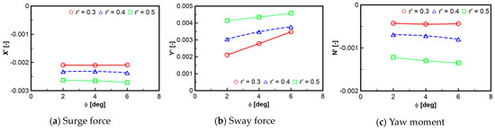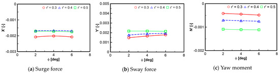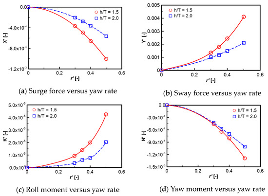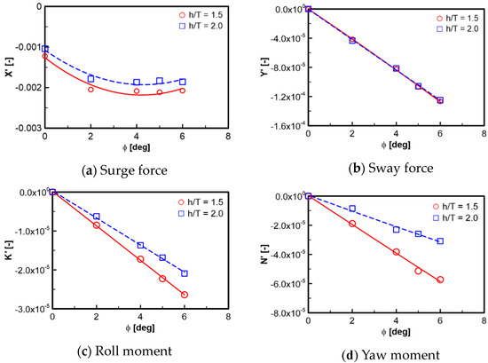 Figure 6, Figure 7, Figure 8, Figure 9, Figure 10, Figure 11, Figure 12, Figure 13, Figure 14 and Figure 15 show the computation results of hydrodynamic forces and moments of the straight-line tests at water depth ratios of 1.5 and 2.0. In general, the overall trend shows that the hydrodynamic forces and moments are augmented when the water depth level is decreased. The roll moment linearly increases with the increase in the roll angle while the other forces and moments have nonlinear variation with respect to the motion constraints. The similar trends for the results of the steady circular tests and the combined heel-CMT and combined drift-heel tests are shown in Figure 8, Figure 10, Figure 11, Figure 12, Figure 13, Figure 14 and Figure 15. The relationship between the surge force, sway force, and yaw moment with respect to the yaw rate is nonlinear. These forces and moments increase with the increase in the yaw rate.