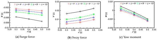 Here, (u′, v′) and (p′, r′) stand for the dimensionless linear velocities along x and y axes and rotational velocities about the x and z axes, respectively. The hydrodynamic coefficients are derived from dimensionless values of the hydrodynamic force and moment by (½ρL2U2) and (½ ρL3U2).