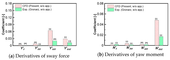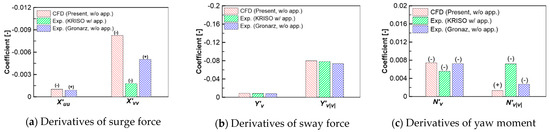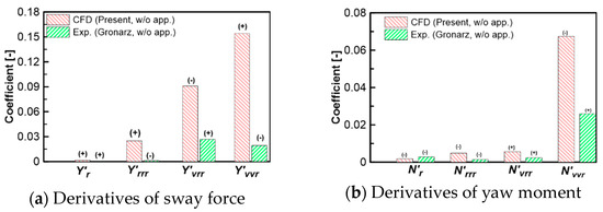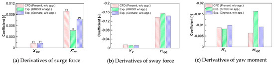 The maneuvering derivatives determined from the current CFD analysis of the KCS in shallow water are verified with the derivatives obtained from the experimental results on KRISO from SIMMAN (2020) [30], the experimental work by Gronarz [11]. From the comparison shown in Figure 17, Figure 18, Figure 19 and Figure 20, it is clear to note that the sway force and yaw moment obtained from the static drift tests are in good agreement with those experimental results from the abovementioned researchers. On the other hand, there is a large discrepancy in surge force between the CFD results and the experimental results on KRISO and some discrepancy in the sway-velocity dependency of the surge force between the CFD result and the experimental data in [11] can be found. Thus, the differences between the current CFD results and the KRISO experimental results might be stem from the interaction between the hull, propeller, and rudder. The sway velocity-dependent derivatives of sway forces and yaw moments are in good agreement with the experimental results on KRISO. However, the nonlinear derivatives of the yaw moment obtained from the KRISO experiment are greater than the derivatives determined from the current CFD computation. On the contrary, the rotary derivatives obtained from Gronaz’s experiments are rather small in comparison with the current CFD results. It is curious that the current CFD study yields a rotary derivative of sway force that is greater than the rotary derivative of the yaw moment but the opposite trend is found in the results of Gronaz’s study. The comparison of rotary derivatives and the cross-coupled derivatives is depicted in Figure 19.