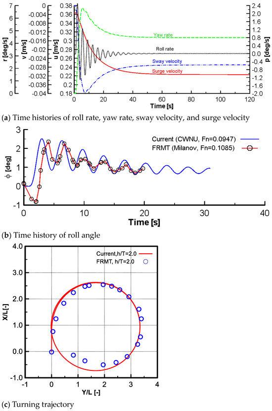 The obtained maneuvering derivatives of the surge force, sway force, roll moment, and yaw moment are tabulated in Table 6 and Table 7 for the water depth ratios of 1.5 and 2.0, respectively. It should be noticed that the surge, sway, and yaw inertia terms have been taken from Mucha [33]. The hydrodynamic forces and moments of the propeller and rudder are referred from SIMMAN (2020) [30]. The vertical center of gravity of the model has been taken from the research of Tezdogan [34]. For evaluating the KCS maneuvering in shallow water, standard maneuvering simulations are performed at a speed of 8.75 knots for the cases of water depth ratios of 1.5 and 2.0. The results from this maneuvering study are then compared with the results of free-running model tests involving the hard rudder turning maneuvers at δR = −35° [12].