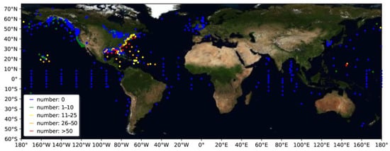 We define TC-induced ocean wave as the ocean wave within a radius of 600 km from the TC center and use the recorded TC-induced ocean waves of the buoy data when the buoy station is within a radius of 600 km from the TC center in the IBTrACS dataset. We combined the global ocean buoy data and the best track data to collect the records of TC-induced ocean waves. Figure 1 shows the spatial distribution of the buoy stations marked by numbers of times (6-h interval; the temporal resolution of the TC tracks in the IBTrACS) when the stations are close to TCs from 1993 to 2020, which is the period covered by the aforementioned datasets (i.e., IBTrACS, NDBC, ERA5, and WAVERYS). The color represents the number of the records with a 6-h interval. When a TC passes near a buoy and the buoy is within a radius of 600 km from the TC center, it is considered as a record of TC-induced ocean wave. There are 3327 observed records of TC-induced ocean waves. Most of them are distributed in the Northern Hemisphere, especially in the ocean waters near the east coast of the United States.