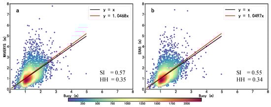 Figure 2 shows scatter plots of SWH from the two reanalysis datasets and the buoy data during the period 1993–2020. The correlations between reanalysis datasets, and observations are all above 0.99. However, the linear regression shows a slope of 1.047 for the WAVERYS (Figure 2a), and of 1.050 for the ERA5 (Figure 2b). Note that the two slopes are similar and both are notably larger than not only the ideal value of 1.0 but also the slopes reported in [11], which focused on global ocean wave rather than on TC-induced ocean waves (e.g., 0.97 in WAVERYS and 0.93 in ERA5). This indicates that, different from the global ocean waves in [11], the SWH of TC-induced ocean waves in the reanalysis datasets is overall larger compared to the buoy data (+0.11 m in both WAVERYS and ERA5). This is consistent with the results in Bethel et al. [47], which showed that the model simulations of large waves (e.g., TC-induced ocean waves) tend to be larger than those observed. Specifically, the differences between the WAVERYS data and buoy data are quite small when the SWH is less than 1 m, and the differences gradually increase with a larger SWH (Figure 2a). The differences between the ERA5 data and buoy data are also quite small with smaller SWH, and increase with large SWH (Figure 2b). Thereby, both the WAVERYS and ERA5 datasets are more accurate in smaller SWH. When comparing the scatter plots of the WAVERYS and ERA5, the distribution of the points in the WAVERYS is quite similar to those in the ERA5 (e.g., most of the points are concentrated around 1 m, and slopes of both reanalysis datasets are similar) (Figure 2a,b), which is due to the fact that the wave model that produced the WAVERYS reanalysis data is also driven by the wind field of the ERA5 [11], and wind plays a decisive role in the development and extinction of ocean waves [48]. Moreover, we see a better SI (Equation (3)) of SWH for the ERA5 of 0.55, in comparison with 0.57 for the WAVERYS. We also see a better HH (Equation (4)) of SWH for the ERA5 of 0.34, in comparison with 0.35 for the WAVERYS. It indicates that the errors of ERA5 are smaller compared with those of WAVERYS.