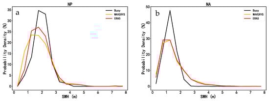 Probability density function for SWH from buoy, ERA5, and WAVERYS data in the two basins. (a) the NP; (b) the NA.
