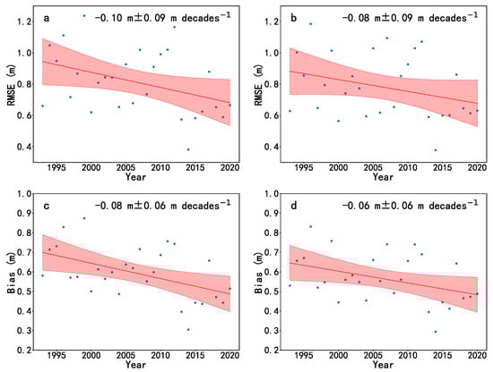 Figure 4 shows the temporal evolution of the errors of TC-induced ocean waves in the reanalysis datasets from 1993 to 2020. The RMSE (Equation (1)) slope for the WAVERYS is −0.10 m ± 0.09 m decades−1 (Figure 4a), and the slope of RMSE for the ERA5 is −0.08 m ± 0.09 m decades−1 (Figure 4b). The slope of bias (Equation (2)) for the WAVERTS is −0.08 m ± 0.06 m decades−1 (Figure 4c), and the slope of bias for the ERA5 is −0.06 m ± 0.06 m decades−1 (Figure 4d). We can see a significant decreasing trend in the RMSE and bias of the reanalysis data over the study period. The RMSE of the WAVERYS and the bias of both WAVERYS and ERA5 pass the 95% significance test, while the RMSE of the ERA5 only passes the 90% significance test. Specifically, for the RMSEs of both WAVERYS and ERA5, the errors in most years before 2012 were higher than 0.7 m, while the errors in most years after 2013 were lower than 0.7 m (Figure 4a,b). For the biases of both WAVERYS and ERA5, the errors in most years before 2012 were higher than 0.5 m, while the errors in most years after 2013 were lower than 0.5 m (Figure 4c,d). This is not a surprise: it is largely due to the increase in computational power running numerical models [49], the incorporation of high-quality observations (e.g., better quality satellite data), and the improvement of the model and its assimilation scheme [31], which led to a significant decrease of errors in the wave model results.