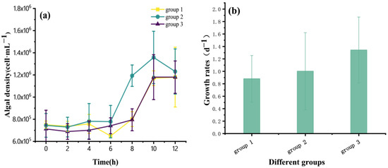 According to the growth curves (Figure 1b), the algal density of the three groups increased with time. Specifically, before 6 h, the algal density increased slowly, and after 6 h, the rapid growth in density was observed. According to the growth rate chart (Figure 1b), the growth rates of group 3, group 2, and group 1 increase successively, and the lowest growth rate of group 1 is 0.88 d−1.
