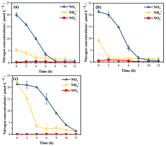 In this study, the concentrations of NO3− and NH4+ exhibited varying degrees of reduction over time. Specifically, in group 1, the concentration of NO3− decreased from an initial value of 19.99 μmol·L−1 at 0 h to 0.62 μmol·L−1 at 8 h, subsequently stabilizing at approximately 0.6 μmol·L−1. The concentration of NH4+ decreased slightly from 5.17 μmol·L−1 at 0 h to 2.06 μmol·L−1 at 4 h, followed by fluctuations within the range of 1.1~1.5 μmol·L−1. The concentration of NO2− increased slightly initially, followed by a gradual decrease, maintaining a concentration between 0.05~0.6 μmol·L−1 (Figure 2a). In group 2, the concentration of NO3− decreased slightly from 21.42 μmol·L−1 at the initial level to 20.11 μmol·L−1 at 2 h, then rapidly decreased to 1.68 μmol·L−1 at 8 h, and further decreased to below 0.85 μmol·L−1. The concentration of NH4+ decreased from 9.22 μmol·L−1 at 0 h to 2.09 μmol·L−1 at 2 h and then remained stable. The concentration of NO2− increased slightly and then decreased, and the overall concentration was lower than 1 μmol·L−1 (Figure 2b). In group 3, the concentration of NO3− changed little in the first 4 h, from 21.33 μmol·L−1 to 20.02 μmol·L−1, and then rapidly decreased to 3.98 μmol·L−1 at 10 h. The concentration of NH4+ decreased significantly from 22.18 μmol·L−1 at the beginning to 3.51 μmol·L−1 at 4 h and continued to decrease from 6~12 h, with the lowest concentration decreasing to 1.21 μmol·L−1. The concentration of NO2− remained below 0.1 μmol·L−1 throughout the experiment (Figure 2c).