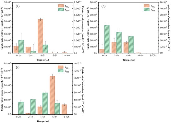 The maximum uptake rate of NO3− was 5.28 × 10−6 μmol·L−1·h−1·cell−1 at 4~6 h (Figure 3a). In group 2, the uptake rate of NH4+ was greater than that of NO3− for the initial 6 h. The largest and smallest uptake rates of NH4+ in group 2 were 4.41 × 10−6 μmol·L−1·h−1·cell−1 and 3.96 × 10−6 μmol·L−1·h−1·cell−1, respectively (Figure 3b). In group 3, the uptake rate of NO3− was higher than that of NH4+ during the 6~10 h (Figure 3c). Notably, the maximum uptake rate of NO3− in group 3 reached 1.05 × 10−5 μmol·L−1·h−1·cell−1, while the maximum uptake rate of NH4+ was 5.94 × 10−6 μmol·L−1·h−1·cell−1.