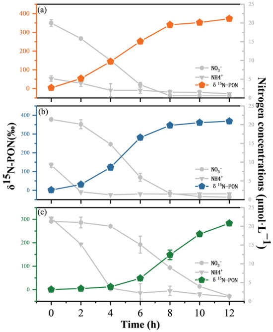 In this study, the δ15 N-PON values in all three groups significantly and continuously increased over time. In group 1, the δ15N-PON value increased rapidly from 4.4‰ at 0 h to 340.3‰ at 8 h, after which the increase slowed and reached its highest value (373.1‰) at 12 h (Figure 4a). In group 2, the overall change characteristics of the δ15 N-PON values were similar to those in group 1, showing a significant increase in the first 8 h, after which the increasing trend slowed. However, it is worth noting that the δ15 N-PON value in group 2 in the first 4 h was lower than that in group 1 at the same time. The δ15N-PON value in group 2 was greater than that in group 1 at 6 h until the results were similar at 8~12 h, with a maximum value of 368.5‰ (Figure 4b). In group 3, the increasing trend of δ15N-PON in the first 4 h was slower than that in the other two groups, increasing to only 122.3‰. Subsequently, the δ15N-PON value increased significantly until it reached the highest value of 283.1‰ at 12 h (Figure 4c).