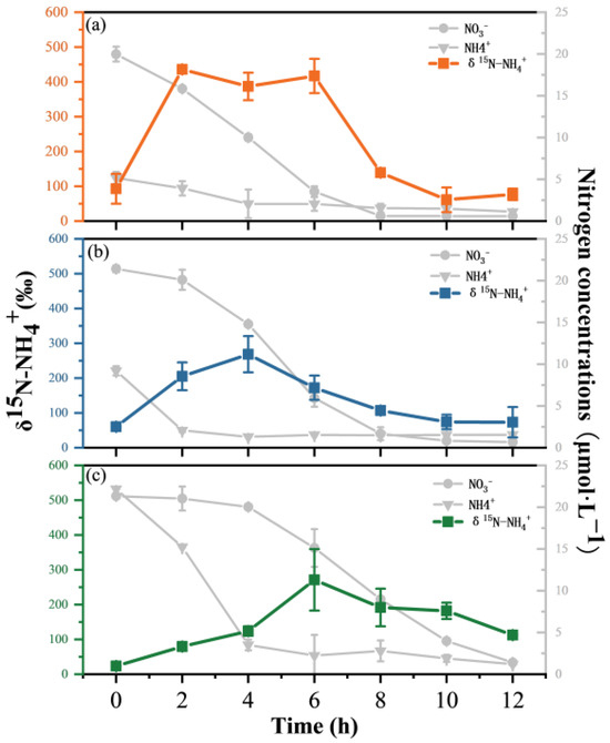 The δ15N-NH4+ values of the three groups of experiments first increased and then decreased with time. In group 1, the δ15N-NH4+ value increased to 436.1‰ at 2 h and then fluctuated in the range of 60 to 420‰. After 6 h, the δ15N-NH4+ value began to decline rapidly, reaching 61.32‰ at 10 h and 76.9‰ at 12 h (Figure 5a). In group 2, the δ15N-NH4+ value showed an obvious upward trend in the first 4 h, reaching a maximum of 268.6‰, and then continued to decrease to 73.4‰ at 12 h (Figure 5b). In group 3, the δ15N-NH4+ value continuously increased in the first 6 h, peaking at 271.3‰ and then continuing to decrease, and the δ15N-NH4+ value decreased to 112.8‰ at 12 h (Figure 5c).