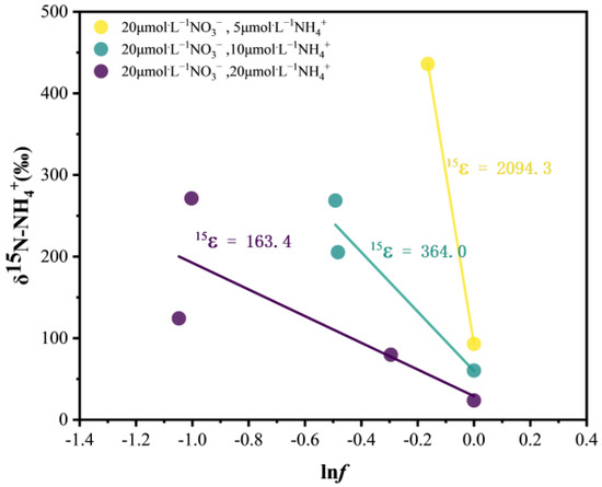 In the variation of isotopic fractionation (ε) of δ15N-NH4+ (Figure 6), it was found that the isotopic fractionation (ε) of group 1, group 2, and group 3 was 2094.3‰,364.0‰, and 163.4‰, respectively, with the largest ε in group 1.